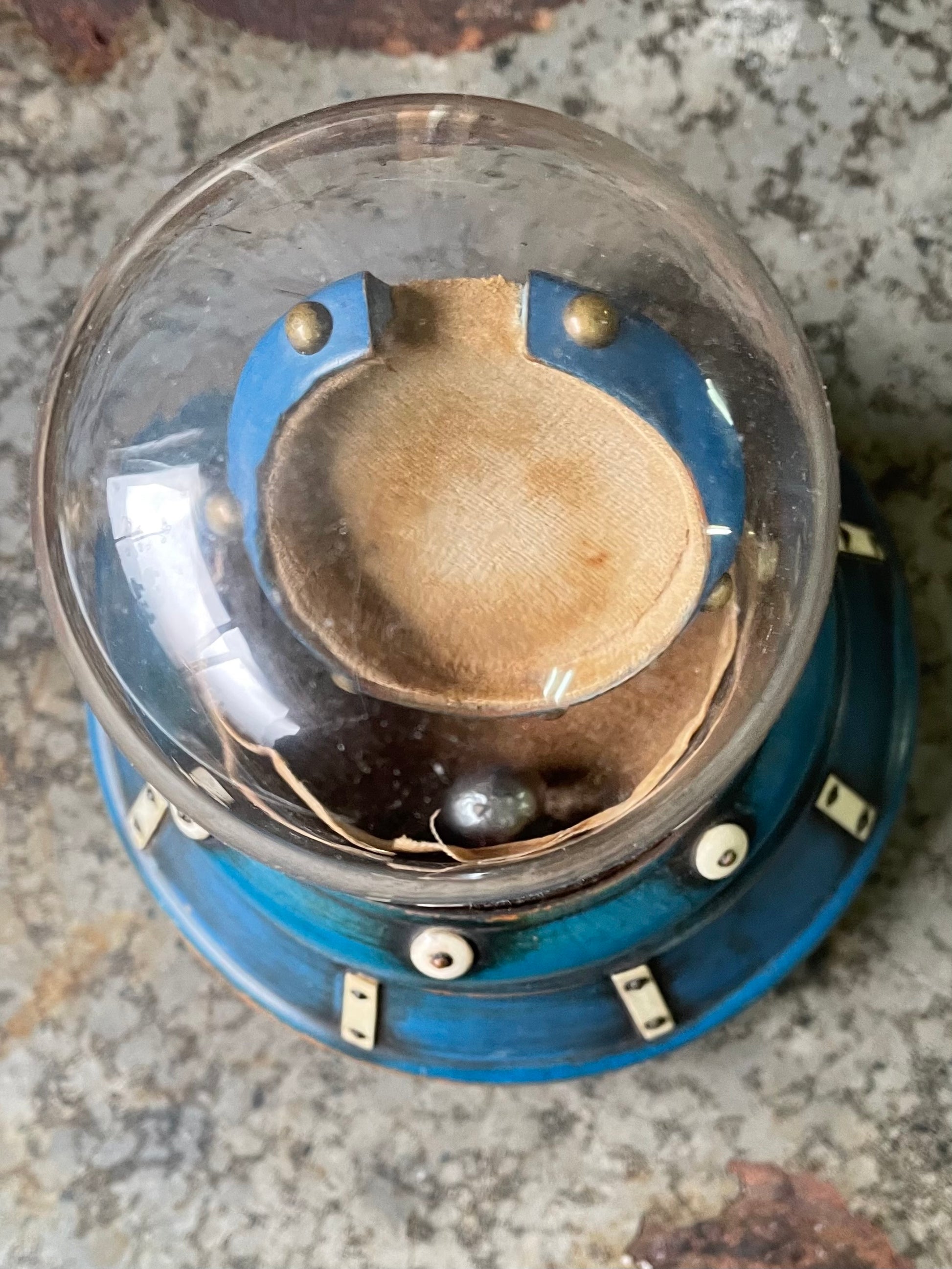 ⭐︎青と白のアクセントが付いたがラスドーム付きの円形時計ディスプレイスタンドです。