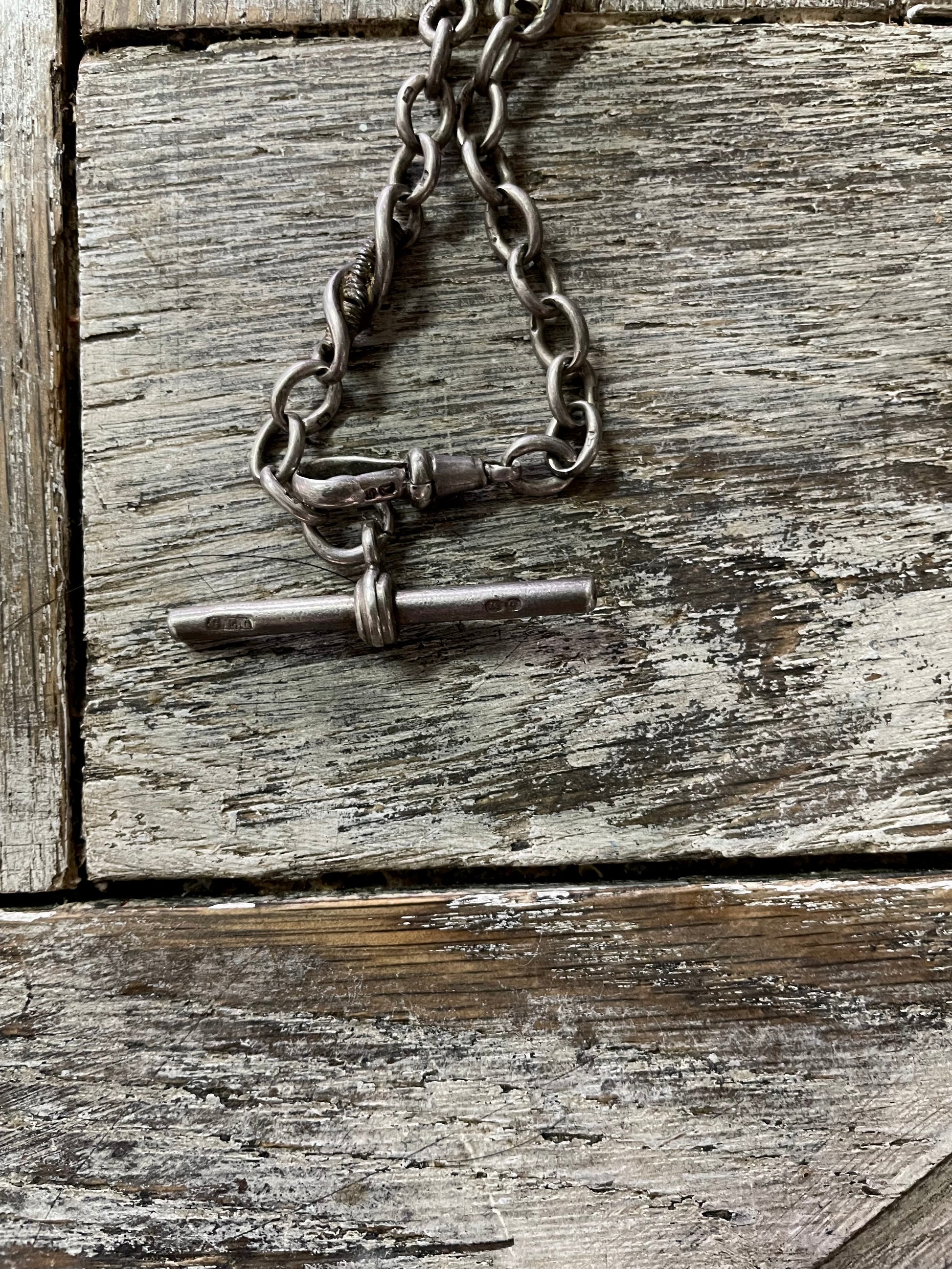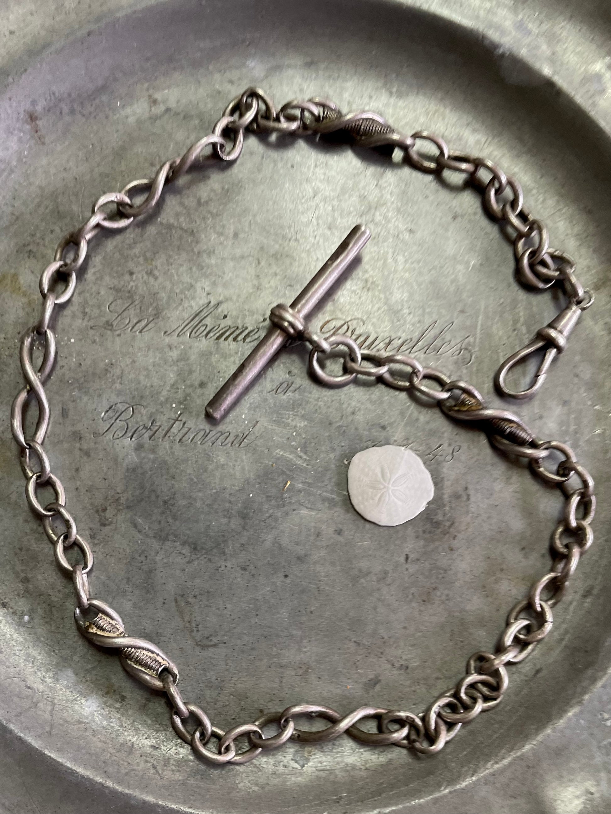 上品なきを放つアンティークベストチェーンネックレス。1900年代初頭、英国紳士が懐中時計を留めるために身に着けていたベストチェーン。時を超えて、ソリッドシルバーの静かな深いきが、ネックレスとして、装う人の個性を静かに引き立てます。