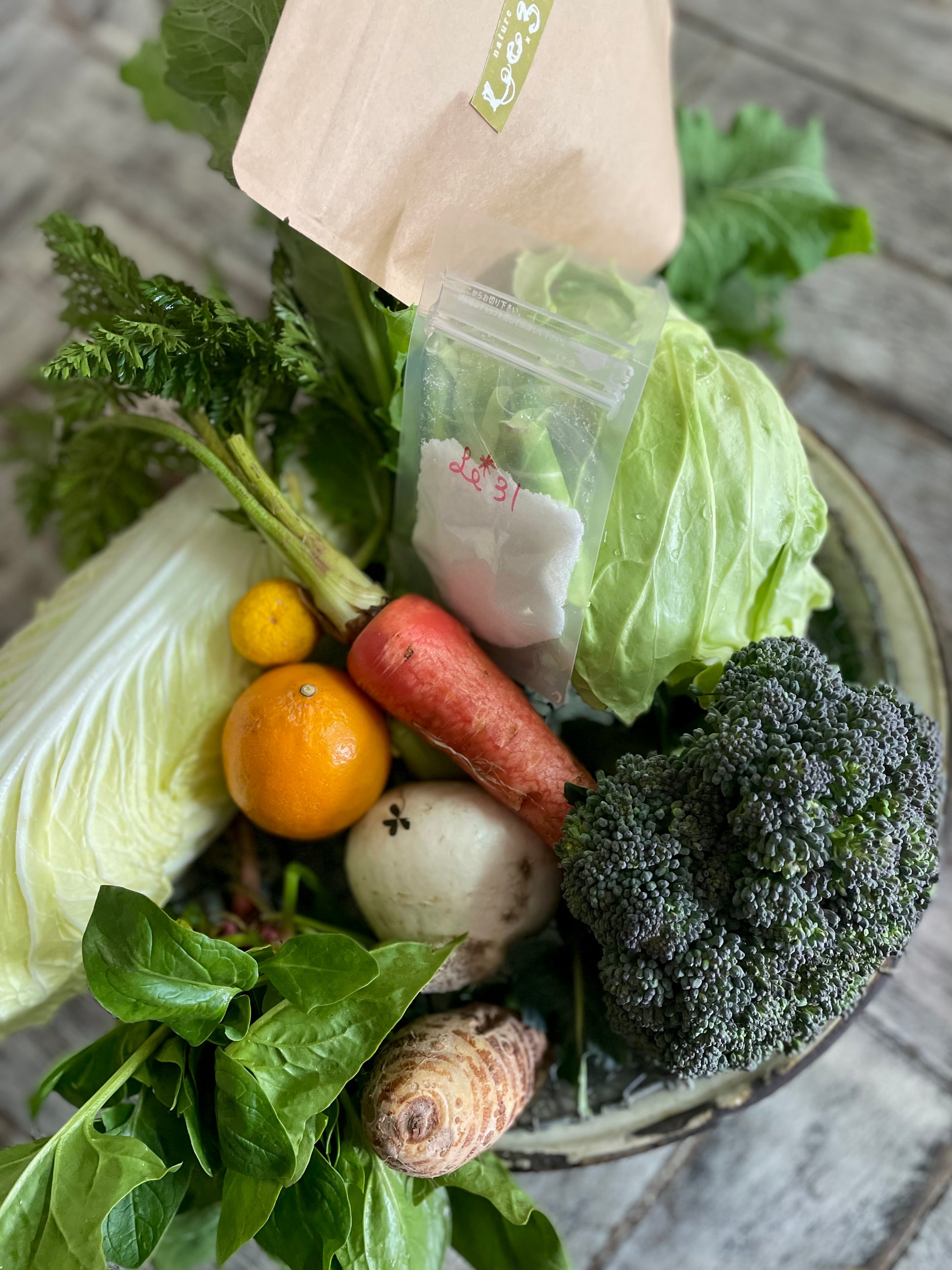 ★蕪、ブロッコリー、白菜、里芋、キャベツ、自然薯、にんじん、マイヤーレモン。
